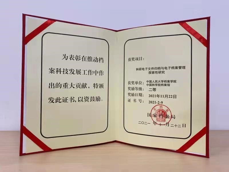 日前,中國人民大學(xué)檔案學(xué)院和中國科學(xué)院檔案館合作完成的“科研電子文件歸檔與電子檔案管理探索性研究”課題,獲得國家檔案局2021年度優(yōu)秀科技成果二等獎。該獎項一等獎空缺,二等獎共10項。